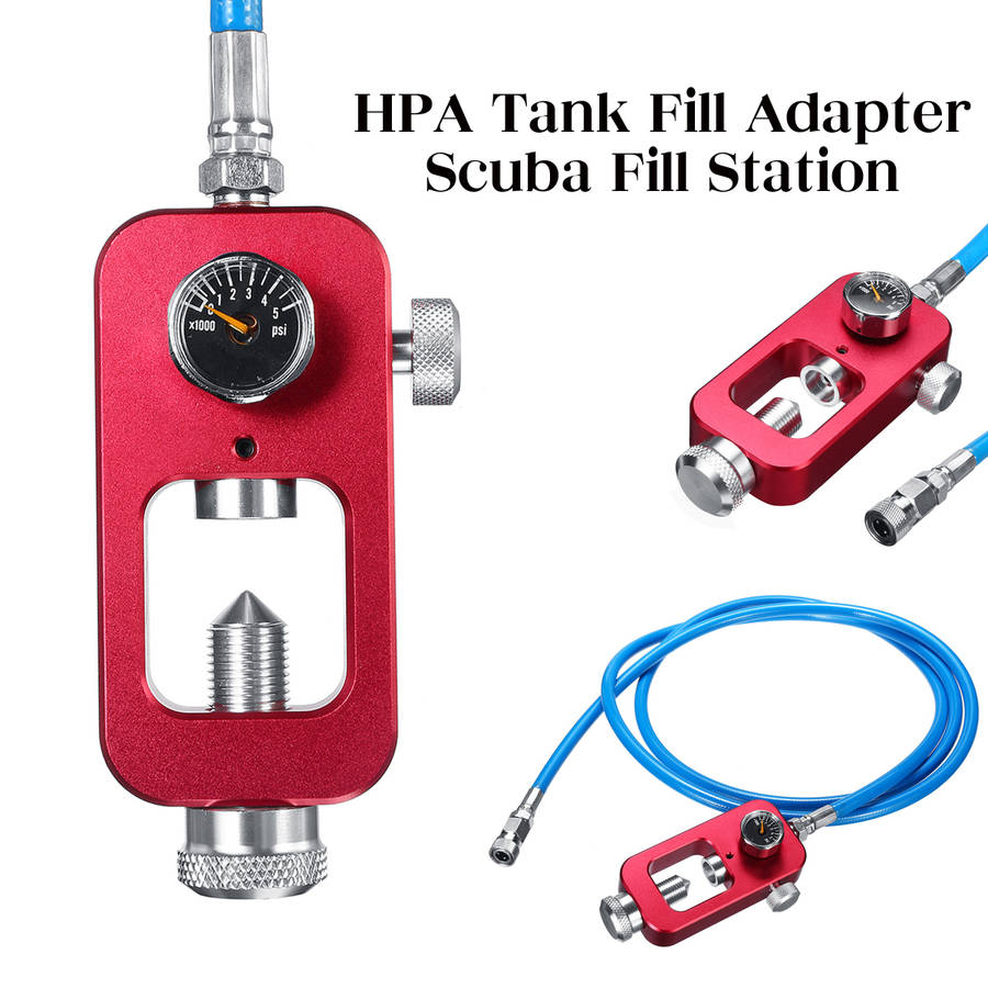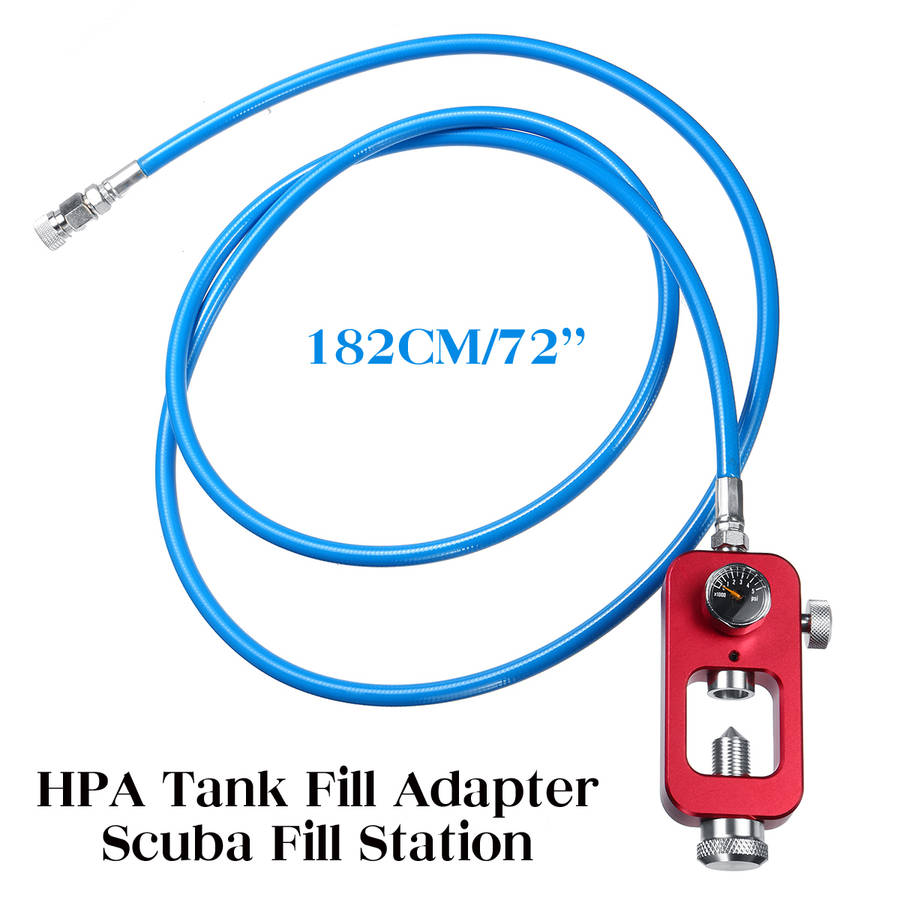 Features 1. This Paintball Scuba Fill Station has a new double o-rings design, longer service life, never leaks! 2. With 182cm High Pressure Fill whip, the whip is not detachable. 3. Compatible with fill compressed air or nitrogen paintball tanks with this scuba fill station. 4. Works with ALL 3000 psi and 4500 psi Aluminum and Carbon Fiber wrapped Tanks. 5. Compatible with Standard Scuba K-Valve, J-Valve and H-Valve. 6. By attaching this simple system to a scuba tank, you can easily fill your paintball tank by yourself. Specification 1. Model: B27475 2. Material: Metal 3. Whip: Blue 182cm Package Include 1 x HPA tank fill Adapter Scuba Fill Station
