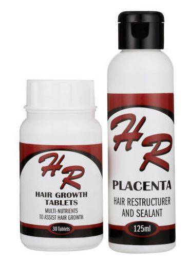 This hair growth kit contains 2 unique hr products that stimulates hair growth both internally and externally.One months supply. For best results, continue using HR.Kit contains:Hair growth tablets.Internal treatment.Placenta.External treatment.Multi-nutrients to assist hair growth 30's.Hair restructurer and sealant conditions & strengthens 125ml.
