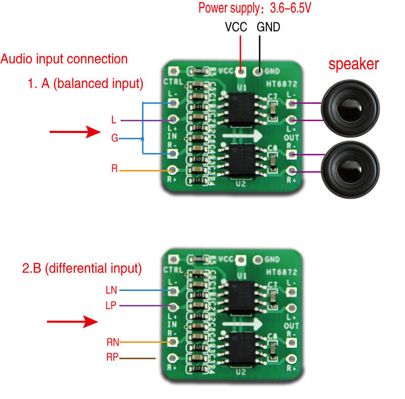 Description: Amplifier board size: 2.1x2.1CM The amplifier board is on ACF mode by default. When using the CTRL mode setting, please sold out R5. Normally the CTRL foot is connected to the Bluetooth MUTE pin. Features: 1.Anti-clipping function 2.Excellent full bandwidth EMI suppression performance 3.Free of filter digital modulation,and it can directly drive loudspeakers 4.Output Power:1.40W (3.6V);2.82W (5.0V);4.71W (6.5V) 5.Good noise suppression performance 6.High Signal Noise Rate:87dB 7.Low Quiescent Current:2.64mA (3.6V);3.26mA (5.0V);4.04mA (6.5V) 8.Low Turn-off Current:0.01uA 9.Overcurrent protection and automatic recovery function 10.Overheat protection function 11.Undervoltage exception protection function Applications: 1.Portable voice box 2.Iphone/Ipad/MP3 docking 3.PMP/MP4/MP5 player 4.Portable game machine 5.PDAs 6.USB voice box 7.Tablet computers 8.GPS 9.Cellphones Package included: 1 x Differential Amplifier Board