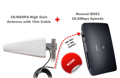 Get the perfect combo to boost your 3G/HSDPA Signal for a fast browsing experience. The Huawei B683 and the 3G High Gain Combo are the perfect solution for Home to Medium Office solution where you need to share high internet speeds with a good browsing experience. The two connect to each other perfectly over the SMA-Male to SMA-Female Interface.