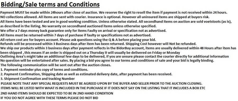R35.00 Standard shipping using one of our trusted couriers applies to most areas in South Africa. Some areas may attract a R30.00 surcharge. This will be calculated at checkout if applicable. Check my rate