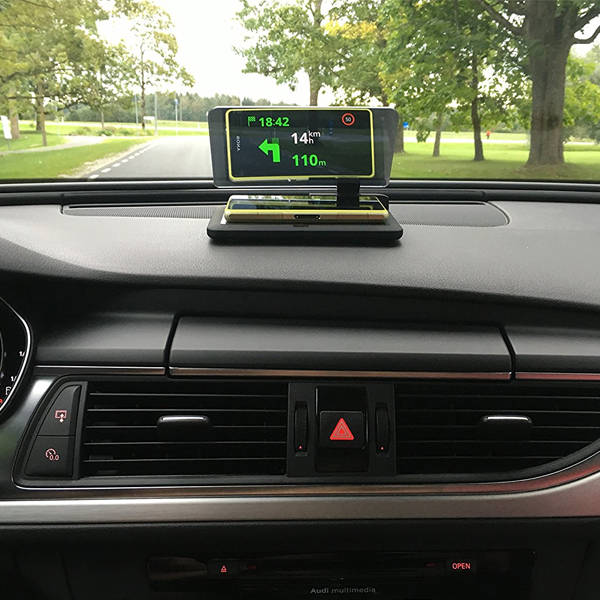 2. The head up display shows/reflects just enough information directly into the driver's field of view, allowing you to maintain constant focus of the traffic, with no extra distraction. Also, you don′t need a additional GPS unit due to turn-by-turn navigation features of modern smart phones apps. It will reflect any HUD-based app (GPS Navigation) image or YouTube video clearly in front of your eyes, letting you see the navigation instructions clearly without lowering your head. 3. You don′t have any need for an extra anti slip mat, car mount nor air vent magnetic phone holder. Our HUD will hold your phone and prevent the phone from sliding off the dash. It can be used with a variety of smartphones such as iPhone 4 5 6 7, Samsung, Sony, HTC, LG etc.