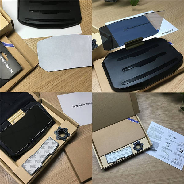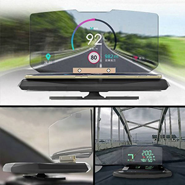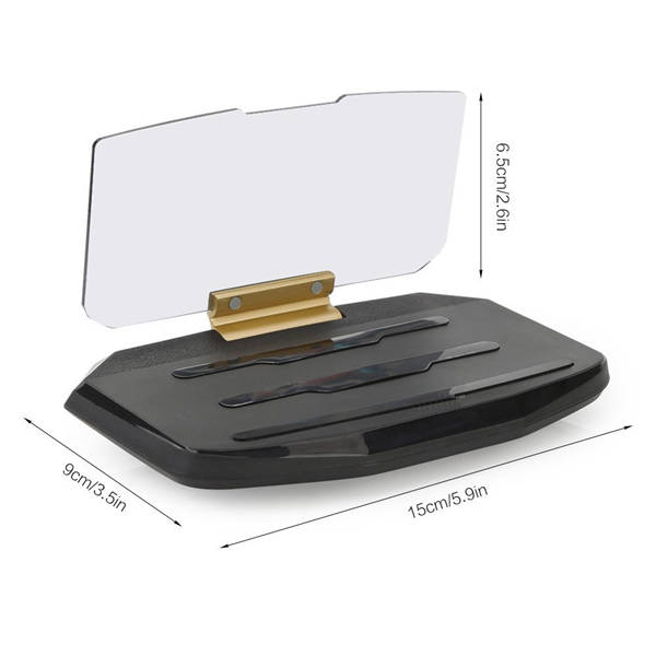 Specification: Material: ABS+Reflector Color: Black Base size: 6.3''(length) x 3.7''(width) x 0.5''(thickness) Screen size: 5.9 x 3.15 inches Suitable for iPhone, Samsung as well as most other smart phones Features: 1. Our product turns any smartphone into a head-up display (hud). It can be used with any car you currently have and it will reflect any hud-based smartphone app. It positions the desired information right in the driver's line of sight and is the most affordable HUD product on the market.