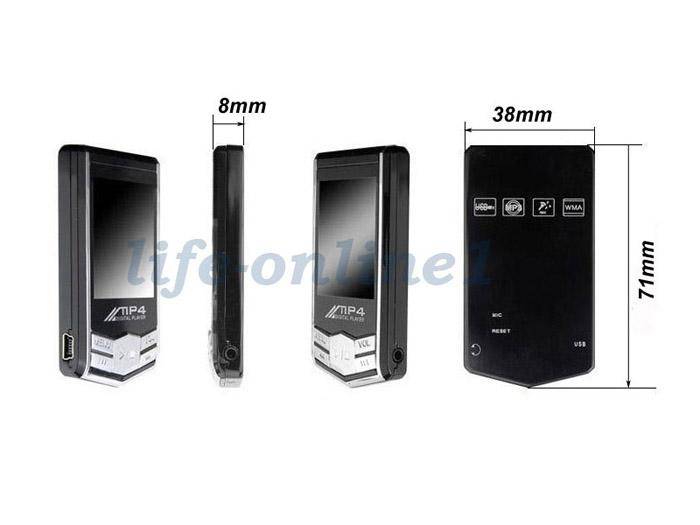 Durable coloured aluminum metal case stylish body design 4GB flash memory 1.8 inch 260K true color TFT screen ID3 tag Support: Lyric display allows Karaoke With E-book and Telephone book function Support Mp3 format Video Support: AMV format, provide software to convert video to AMV movie format Built-in clock Built-in Picture Viewer Built-in microphone for digital voice recording Built-in FM Radio (Tuner 87MHz - 108MHz), allow to pre-set radio stations Support file folder management Battery: Lithium-ion Rechargeable battery (Build-in & recharge by charger or USB port) 2 Replay Mode: Manual Replay, Auto Replay 4 Record Mode: Long VOR, Fine VOR, Long Rec, Fine Rec 7 Play Modes: Normal, Repeat One, Repeat all, Folder, Repeat Folder, Random, Intro 7 Preset EQ: Normal, Rock, Pop, Classic, Soft, Jazz, DBB 25 languages support: English / French / German / Italian / Spanish / Portuguese / Swedish / Czech / Dutch / Danmark / Polish / Russian / Korean / Japanese / Chinese etc Support WINDOWS 98/ME/2000/XP/Vista/7 Size(L x W x H): 70mm x 37mm x 7mm