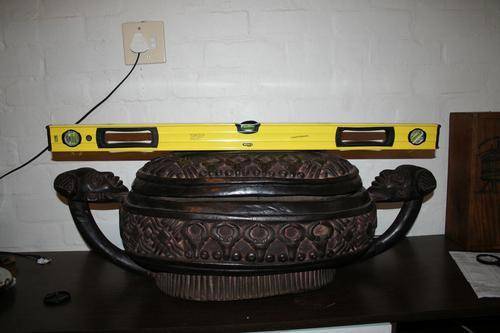 The would sit well on a big table in a game lodge or afican themed home - I have tried to give an idea of scale - please see the 1.5 litre Magnum wine next to the carved casket - good detail on the piece dimesions 900mm x 400mm x 400mm