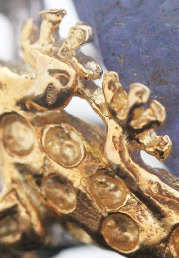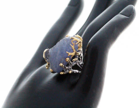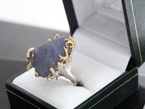 This eye-catching ring is handcrafted in sterling silver, and features a large natural tanzanite with a very good deep lilac colour set au natural into the ring. The gemstone is claw set, with the sterling silver claws organic and twiglike in nature, and ending with a gold hue finish on the tips of each claw. The 26mm long x 18mm wide ring head is raised a splendid 15mm above the finger! The shank forks into 2 low down on the finger, splaying organically on the shoulders to support the large stone. The detailing in the shoulders is fascinating - describing an openwork circle on the one side. This piece will appeal to someone who loves the natural beauty of earth-mined gemstones without the faceting.