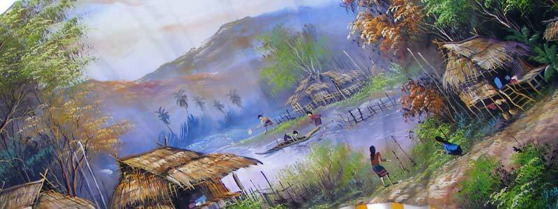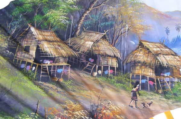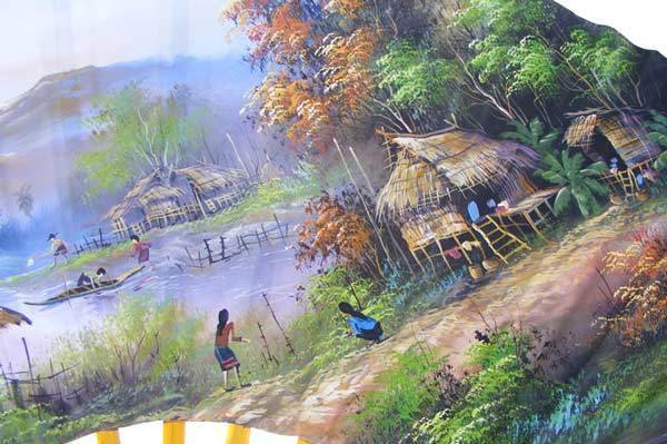 Huge Oriental Fan - Handpainted on canvas - Village scene - 155cm wide! Chinese/Japanese collectors!