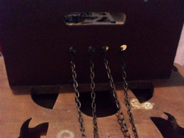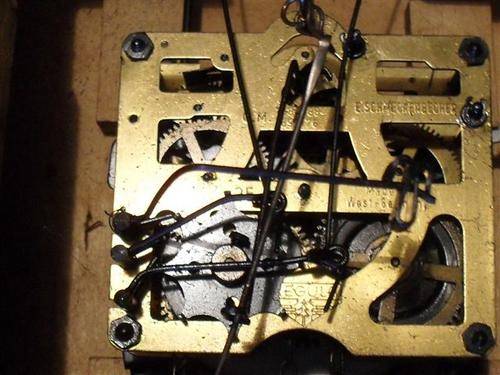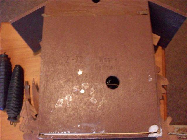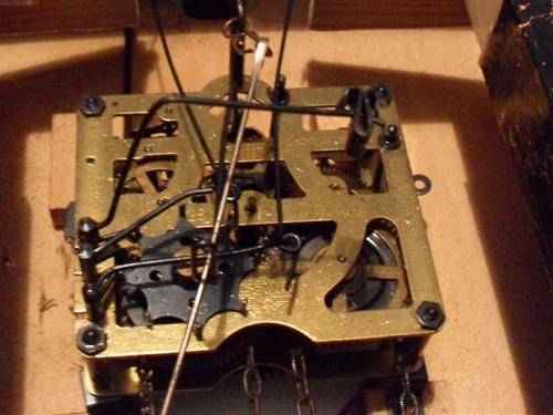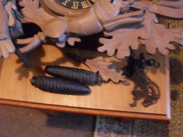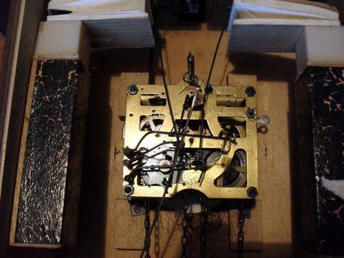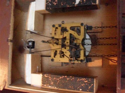 HAS WEIGHTS PENDULUM AND CHAINS...I ALSO SEE A PIECE OF WHITE TAPE IS STUCK ON THE 1 BELLOWS...PLEASE VIEW THE MANY PICS AVAILABLE ....