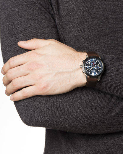 Modern and sophisticated, this HUGO BOSS mens watch features a Blue Textured dial with silver hands and markers.