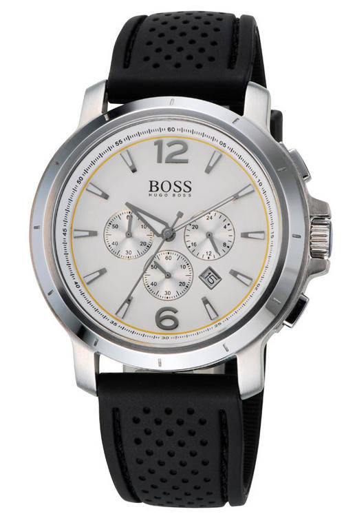 Modern and sophisticated, this HUGO BOSS mens watch features a black dial with black & white colour chrono dials and a black IP bezel.