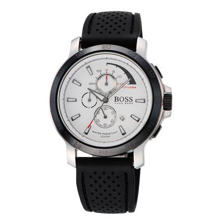 Modern and sophisticated, this HUGO BOSS mens watch features a black dial with black & white colour chrono dials and a White IP bezel.