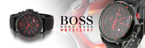 The Hugo Boss 1512597 gents watch has a stainless steel / black colour finish round case with a fixed bezel and a black colour dial. The dial features red colour hour markers, hour, minute hands and second hands, a small date window positioned between 4 and 5 O`clock and three subsidiary dials. The three subsidiary dials hold the 24 hour time and chronograph stopwatch: