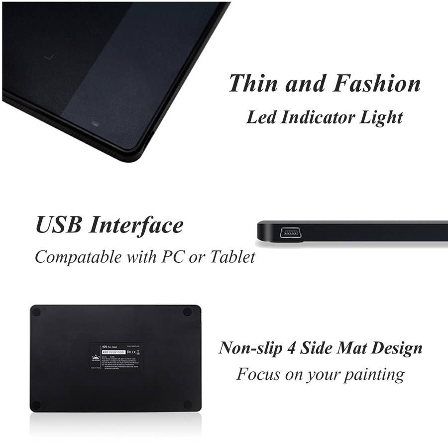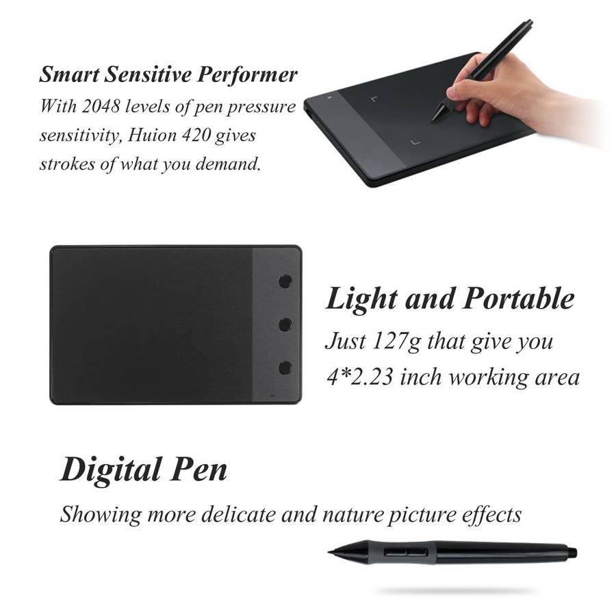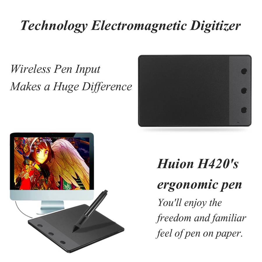 1. Brand: Huion 2. Model number: H420 3. Color: Black 4. Active Area: 4 x 2.23"" 5. Resolution: 4000 LPI(Line Per Inch) 6. Report Rate: 200RPS 7. Pen Pressure: 2048 Levels 8. Express keys: 3 Express keys 9. Reading Height: 0.6" 10. Supply Voltage: DC 5V 11. Power Consumption: 0.35W 12. OS Supportor above Windows 8.1/8/7/Mac OSX10.8 or later 13. Interface Support USB 14. USB cable length: 1.5M 15. Compliance CE/FCC/CCC 16. Dimensions 176.6mm x 115mm x 7.5mm