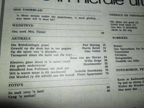 ( MODJADJI - REENKONINGIN - RHODESIA - ANDRIES MAAKE , MEJ TIENER , BOXING - LOUW STRYDOM - FRED STORBECK , ALEC STORBECK , GERRIE DE BRUYN , BARKLY KLEUTERSKOLE , SEEKATTE - OCTOPUS - JOHN PRESCOTT DUIKER , P.H. NORTJE , PAT PRETORIUS - TENNIS - SPORTALBUM , OP PAD NA NERENS - WILLE VAN RENSBURG , MAZDA RX2 )