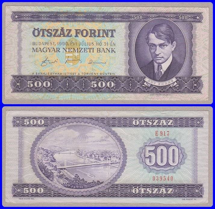 HUNGARY - 1990 - 500 FORINT - PIC# 175a - F/VF NOTE - SER# E917 039540