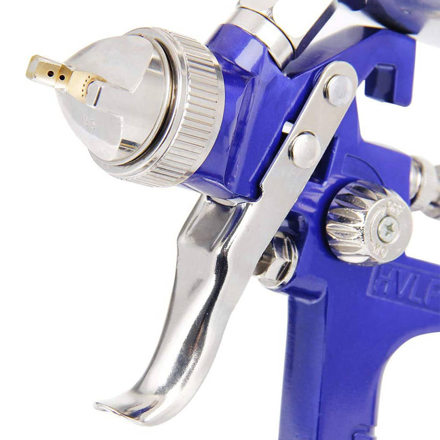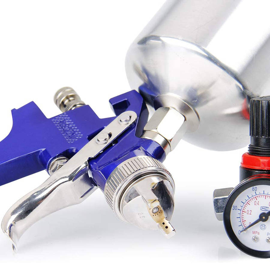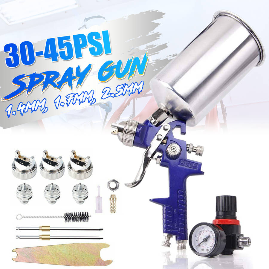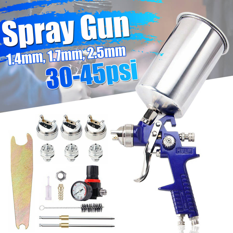 Specifications: Air Inlet: 1/4 + Barbed and Nitto Plug Nozzle size: 1.4mm, 1.7mm, 2.5mm Operating pressure: 30-45 psi Air consumption: 1.6-4 CFM Compressor required: 2-3 HP Guns dimensions (without cup): 15 x 18.5cm Ready to connect hose or nitto socket Features: - This spray guns set is designed to provide equal atomization and partical size for all kinds of surface painting. - It has control knobs for full adjustment over spray pattern, fluid control and air pressure. Contains 1.4mm/1.7mm/2.5mm stainless steel needles and nozzles set to meet your different applications. - Light weight, ergonomic design and easy trigger pivots reduces operating fatigue. - Ideal for spraying base coats, clear coats and other high viscosity coatings such as extreme high build or polyester primers, thick enamels, latex paints, chip guard, metal flakes, gel coats, liquid mask, etc. - High atomisation with low nozzle air pressure. - Saves paint and protects the environment. - Easy use with high efficiency and very fast application time. Package Included: 1 x Spray Guns 1 x 1.4mm Nozzle 1 x 1.7mm Nozzle 1 x 2.5mm Nozzle 1 x 1000cc Aluminum Cup(1L) 1 x True Micrometer Air Regulator with Gauge 1 x Barbed Tail 1 x Adjustment Wrench More Details: