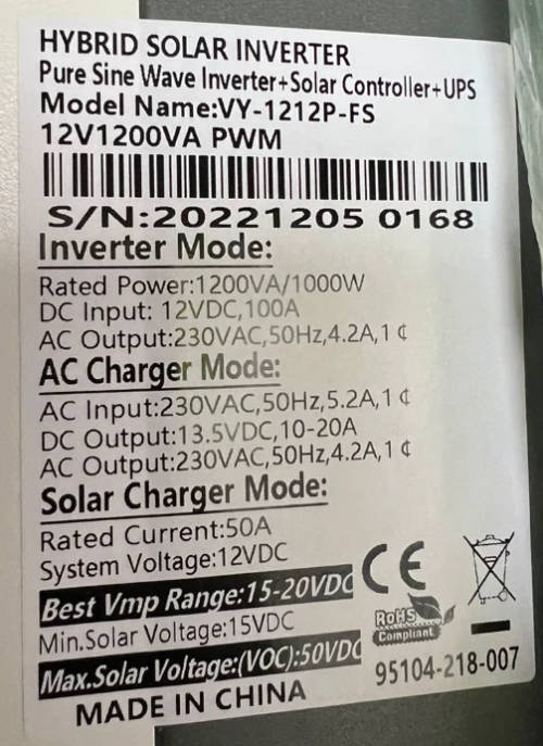 FiveStar 1.2KVA 12v Pure Sine Hybrid Solar Inverter with Built-In 50Amp PWM Solar Controller
