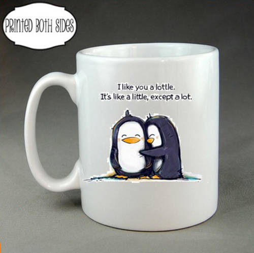 “I like you a lottle. It’s like a little, except a lot” is the slogan on this coffee mug combined with two adorable penguins drawn by the famous comic artist and illustrator Kicking Cones Katrina.