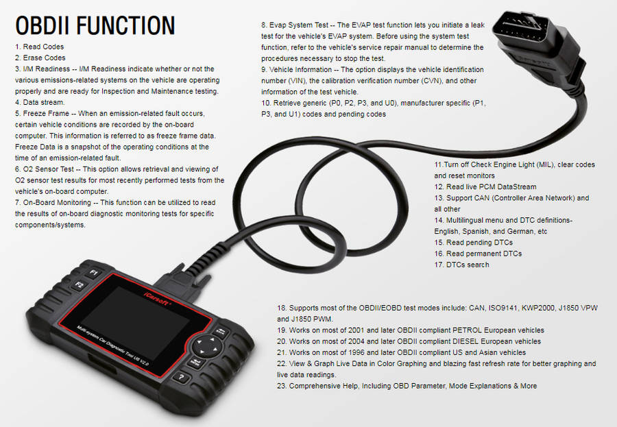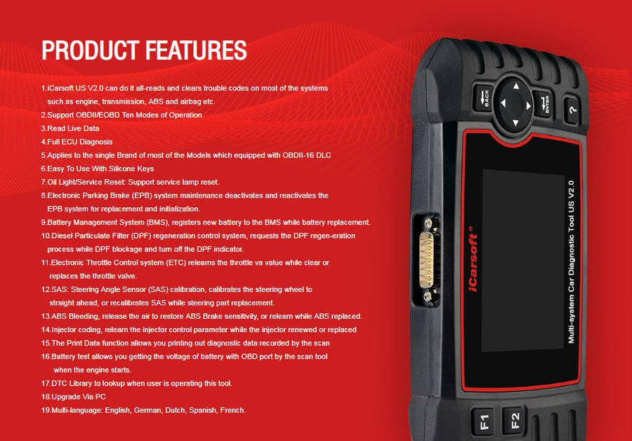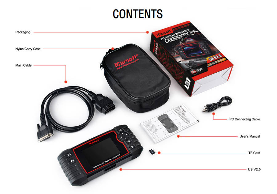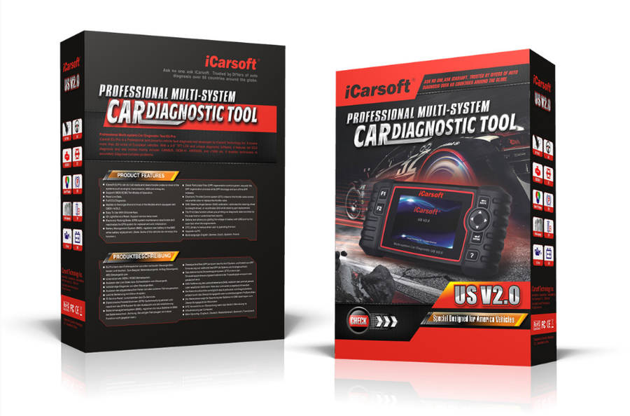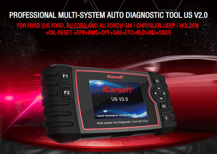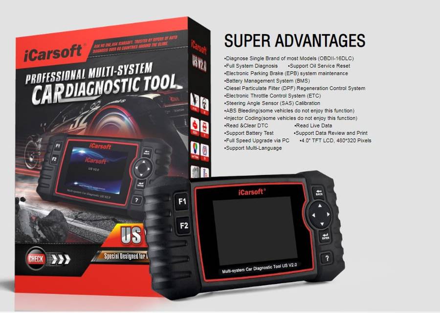 iCarsoft US V2.0 is a Professional and powerful vehicle fault diagnosis tool for Ford/ GM/ Holden developed by iCarsoft Technology Inc. With a 4.0" TFT LCD and unique diagnostic software, it features full ECU diagnosis of single vehicle brand and test modes mainly include: CANBUS, ISO9141, KWP2000, and J1850 etc. It enables technicians to accurately diagnose complex problems.
