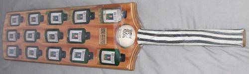 Plastic wrapped bat with small golden plate: "ICC Cricket World Cup South Africa 2003"