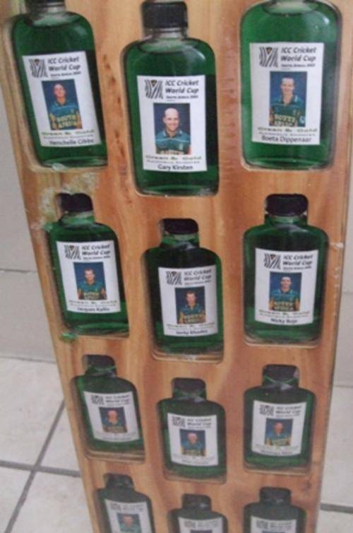 13 filled alcoholic shooter bottles with pictures of each of the players and their names on it. On back of bottles is details of the player.(age, height, batting average, etc)