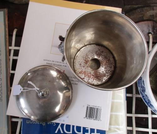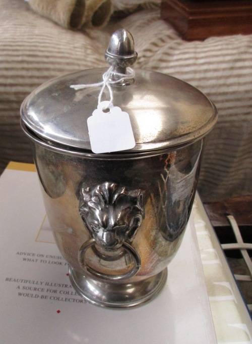 The plate is worn to the drip holder otherwise its in good condition lion mask handles and it does have a lid