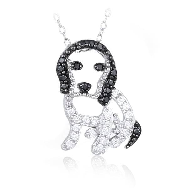 This whimsical dog necklace displays black and white cubic zirconia stones studded all around. This highly polished pendant dangles from an 18-inch cable chain and is crafted of fine sterling silver.