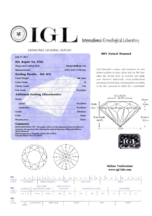 IDEAL CUT!!!!!- **IGL CERTIFIED AND VALUED** D TOP WHITE 1.08ct VS2 [ 115 800.00] DIAMOND!
