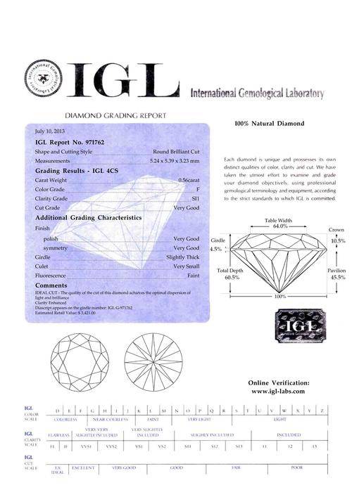 NB The original certificate comes with this diamond - Verifiable on line at http://www.igl-labs.com/en/verify.asp Input in report number (971762)(NB do not put in the G here) & date = 07/10/2013 (month/day/year)