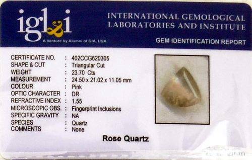 IGLI Certified 23.70 Carat Rose Quartz Gemstone-Triangular Cut