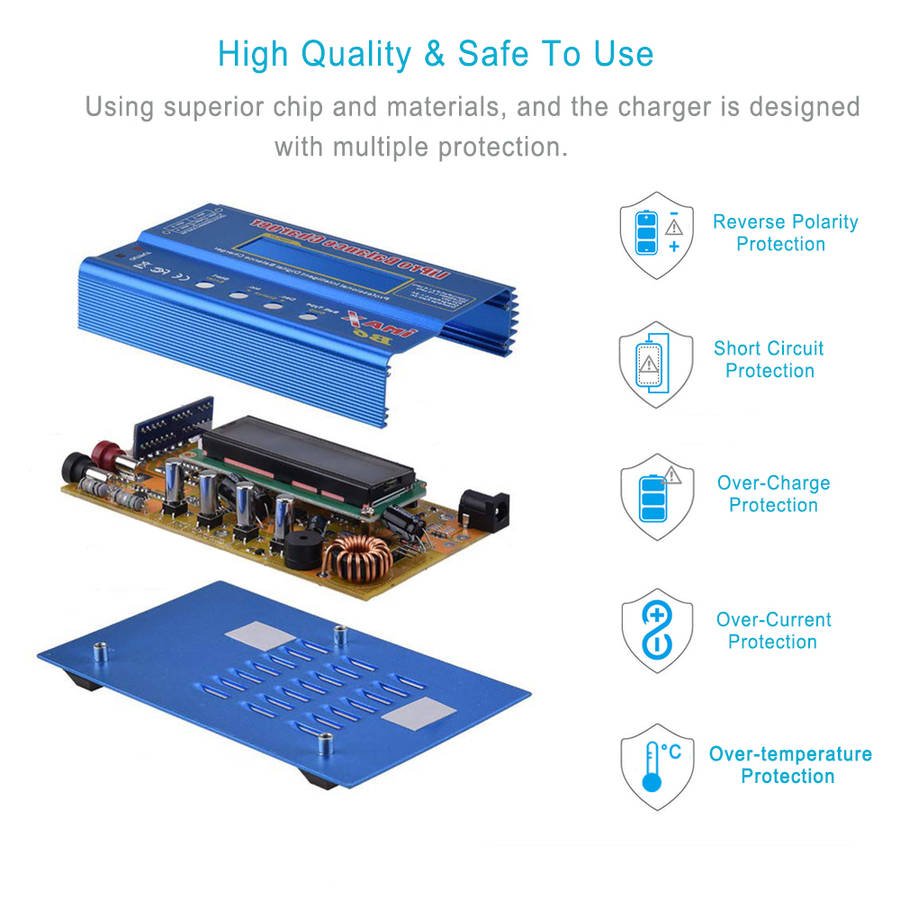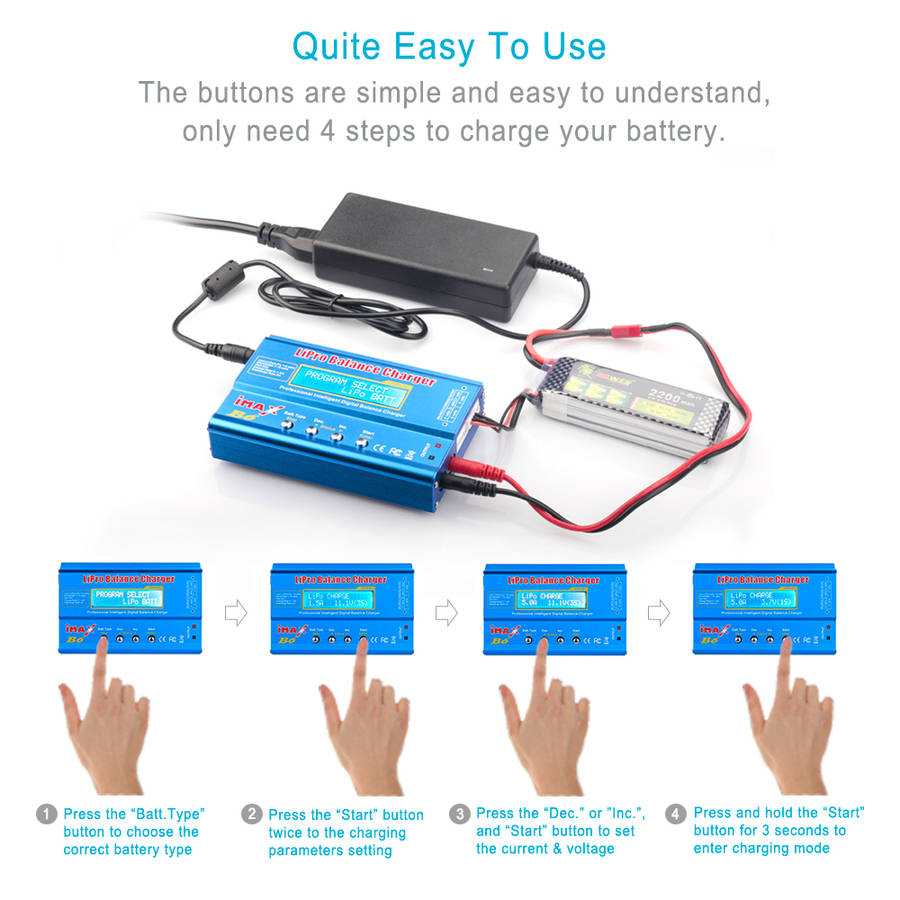 Big discount . Features: 1. Microprocessor controlled peak sensitivity 2. Individual cell balancing Li-ion, LiPo and LiFe capable Ni-Cd and NiMH capable 3. Large range of charge currents Store function, allows safe storage current 4. Time limit function 5. Input voltage monitoring. (Protects car batteries at the field) 6. Data storage (Store up to 5 packs in memory) 7. Battery break in and cycling. 8. Support new generation? system (LiFe) battery Specification: ? Color: Blue Size: 5.2 x 3.3 x 1.0 / 13.4cm x 8.6cm x 2.7cm (approx) Plug: EU/UK/AU/US Plug AC Adapter:Input:100-240V, 50/60Hz. ? ? ? ? ? ? ? ? ? ? ?Output: 15V 6A Operating voltage range: DC 10.0 - 20.0 Volt AC to DC adaptor (DC 10.0-20.0V/6A) Circuit power:? Max . charge power 80W Charge current range: 0.1 - 6.0A Discharge current range: 0.1 - 2.0A? Current drain for balancing Li-po: 300mAh/cell NiCd/NiMH Battery cell count : 1-15cell Li - ion / Polymer cell count: 1 -6 series Pb battery voltage: 2v - 20v ? Package included: ? 1XIMAX-B6 Lipo? Intelligent Digital Balance Charger 6XCharging cables 1XUser manual 1XSet of plug adapter??