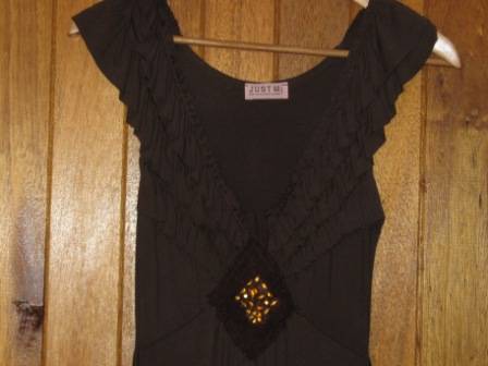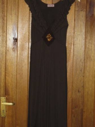 Gorgeous imported brown Summer dress with frill and jewel detail . The dress has a tie detail at the back and is very flattering on . It is by the label JUST M and is made in Paris . It has been worn but is still in excellent condition . It will fit a size 32 - 34 .