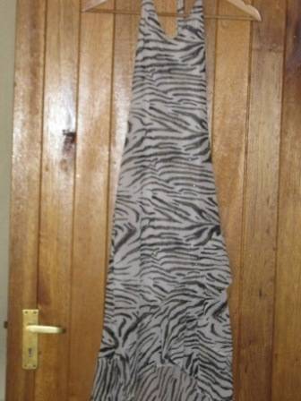 Lovely imported Summer dress with a halterneck and Zebra print . It has a gold thread in it which makes it suitable to wear in the evening as well . The dress will fit a size 32 . It has been worn but is in excellent condition .