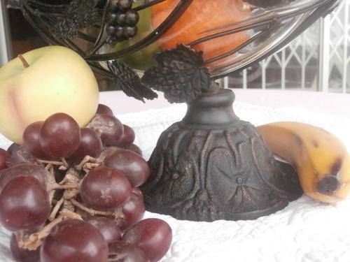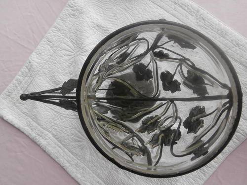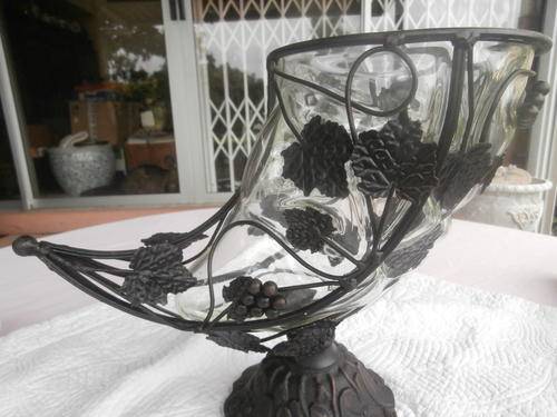 DRAMATIC DISPLAY PIECE, LARGE STANDING GLASS VASE MOULDED WITH CURVED SHAPES RESEMBLING A CORNACOPIA. IT HAS A METAL VINES AND GRAPES SURROUND GIVING THE ITEM A VERY UNUSUAL LOOK. HIGHLY DECORATIVE AND COULD BE USED TO DISPLAY FLOWERS I AM SURE. EXCELLENT CONDITION, NO CRACKS AND DAMAGES REPAIRS TO METAL CASING OR STAND