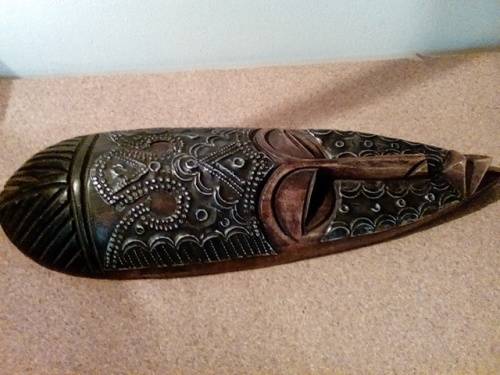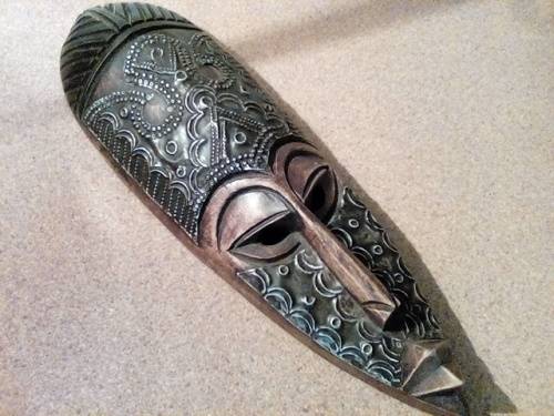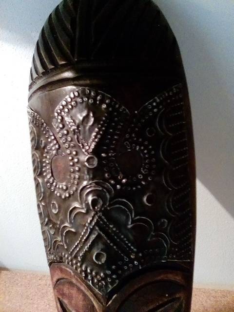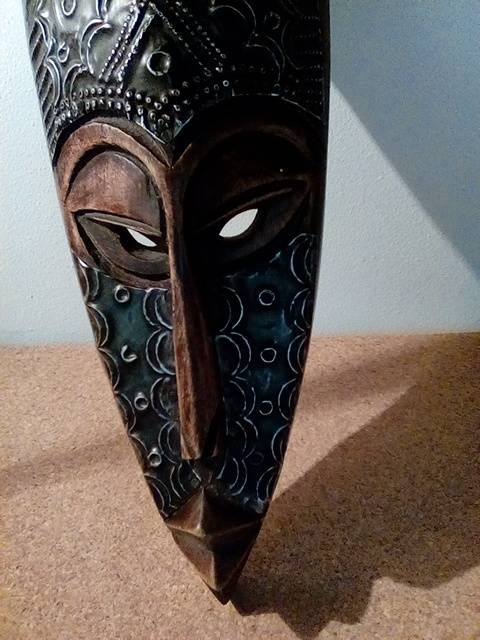 Impressive Wooden African Mask with Pierced Metal Overlay