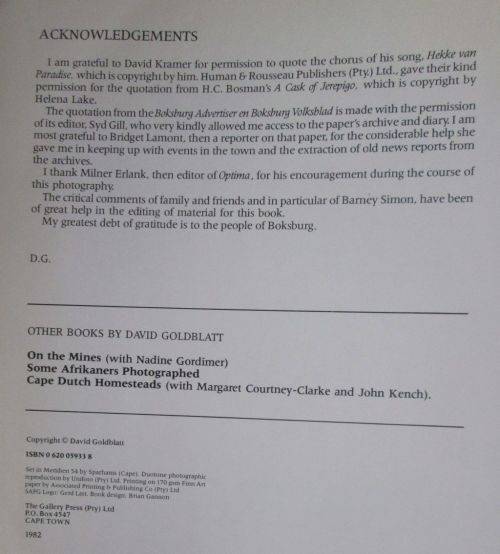 Legendary talent! Black cloth boards, white lettering, the very first edition originally published by The SA Photographic Gallery, 1982 without a dust jacket. Very good, tight condition for its age, marks and wear to the covers, slight shelf wear to edges, also head and foot of spine, light marks to front end papers. 82 pages and 71 black and white photographs.Tracked postage is R75.00.