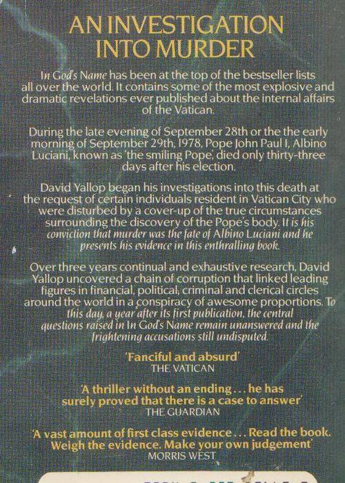 In God's Name By David Yallop - Investigation Into The Murder Of Pope John Paul 1, published in 1985, 479 pages, softcover, scuffing etc and inscription on 1st page however all pages are intact and are quite readable.