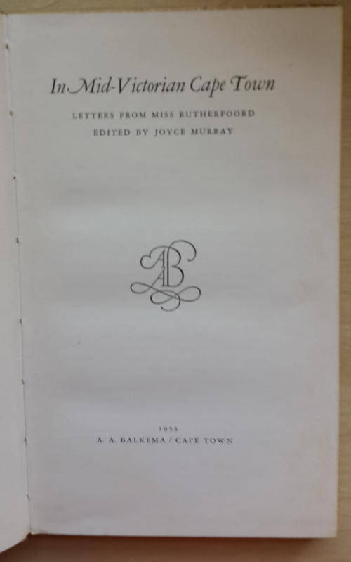 "March 23rd, 1852, was Mary Rutherfoord's Wedding Day, the day on which her younger sister Emma succeeded to the title of 'Miss Rutherfoord'. Emma was nearly eighteen and very conscious of the dignity of her new position and the responsibilities it entailed. For the next four years she carried out her duties as the eldest daughter at home, paying calls with Mama and helping her to receive visitors, giving out the household stores each morning and keeping the weekly household accounts, and being an example to her younger sisters. In 1856 she became Mrs. Andrew Murray, and went out into the wilds of the Orange Free State to share with her husband the trials and hardships of his work in Bloemfontein. The following letters were all written during this period before her marriage, and give a picture of happy family life in fairly comfortable circumstances, in Cape Town of the fifties.".