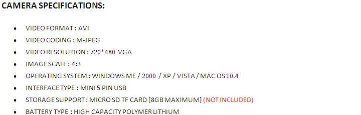 A GREAT LITTLE CAMERA, VERY SMALL AND LIGHTWEIGHT WITH A 720 X 480 PIXEL RESOLUTION THAT IS IDEAL FOR SPORTING ACTIVITIES AND SURVEILLANCE.