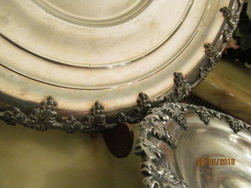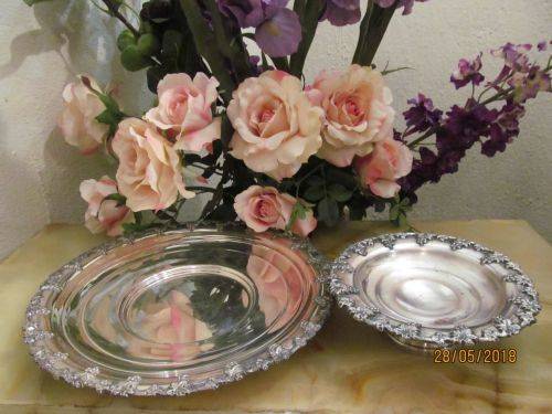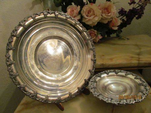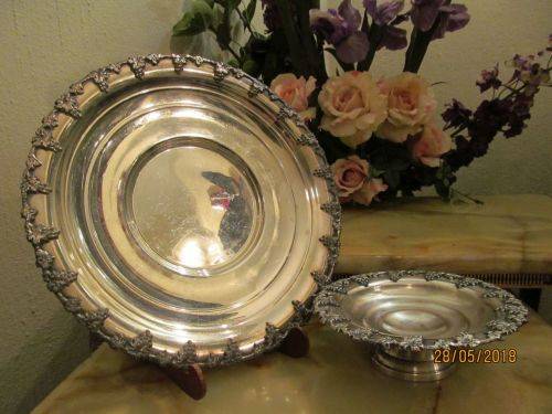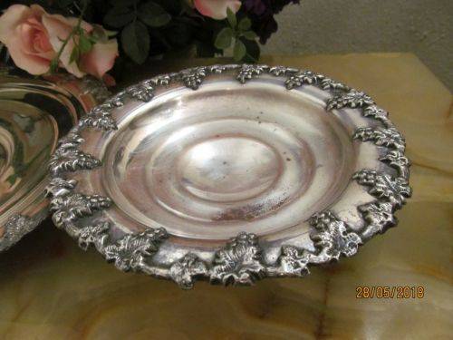 A SET OF MARVELOUS VINTAGE SILVER PLATED DISHES MANUFACTURED IN ENGLAND BY SERANCO EACH LAVISHLY DECORATED ALONG THE RIM BY THE PRESENCE OF EMBELLISHED GRAPE AND GRAPE LEAF IN ORNATELY RAISED DETAIL. THE SET CONSISTS OF A PEDESTAL SWEETS / BON BON DISH WITH A GRADUATED TRUMPET SHAPE STAND AND A GRADUATED CENTER ENCIRCLED BY THE GORGEOUSLY DECORATED VERGE. ALONG WITH THIS ITEM IS A LARGER DISH WHICH IS PERFECT FOR DISPLAY OR SERVING PURPOSES AND IS ALSO CRAFTED WITH A GRADUATED CENTER.