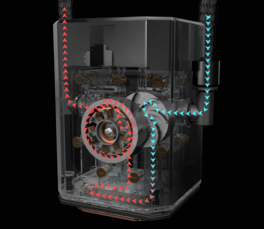 The patented twin-turbine function runs parallel with one another and functions simultaneously to push both currents toward the copper cold-plate to significantly reduce the temperature and keep hardware cool.