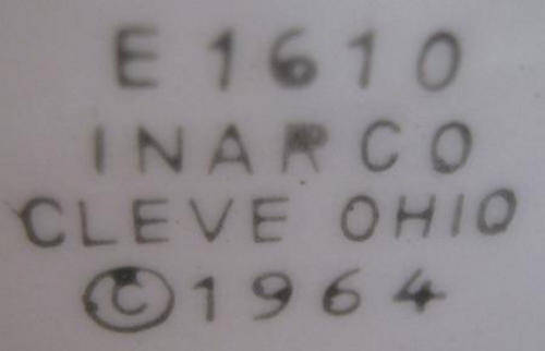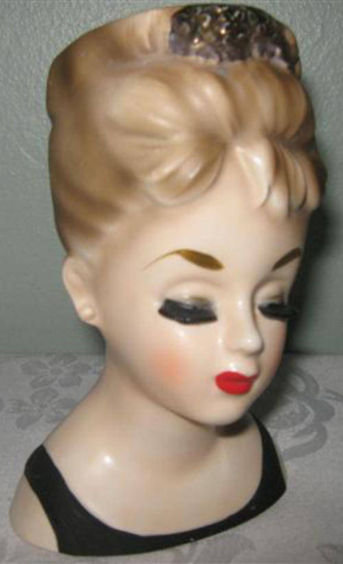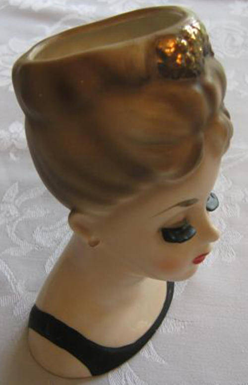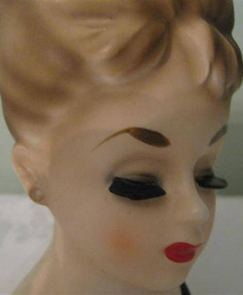 GLAMOUR GIRL, A REGAL LOOKING YOUNG LADY WEARING A GOLD HAIRPIECE, HER LIGHT BROWN HAIR STYLED IN A " UP DO " SHE IS WEARING A SIMPLE MATTE BLACK DRESS AND HAS LONG, VERY LONG EYELASHES AND HAS BRIGHT RED LIPS. ONE OF HER PEARL EARINGS IS MISSING, I AM NOT SURE IF SHE ONCE WORE A PEARL NECKLACE. THERE ARE NO CHIPS OR CRAZING TO HER, AND THE VASE IS CLEAN INSIDE. THIS HEAD VASE BEARS THE BRAND INARCO, E 1610, CLEAVELAND, OHIO, 1964.HEIGHT 13.2CM, LENGTH OF BASE 8CM, DIA AT THE TOP OF HER HEAD 6CM.