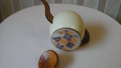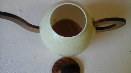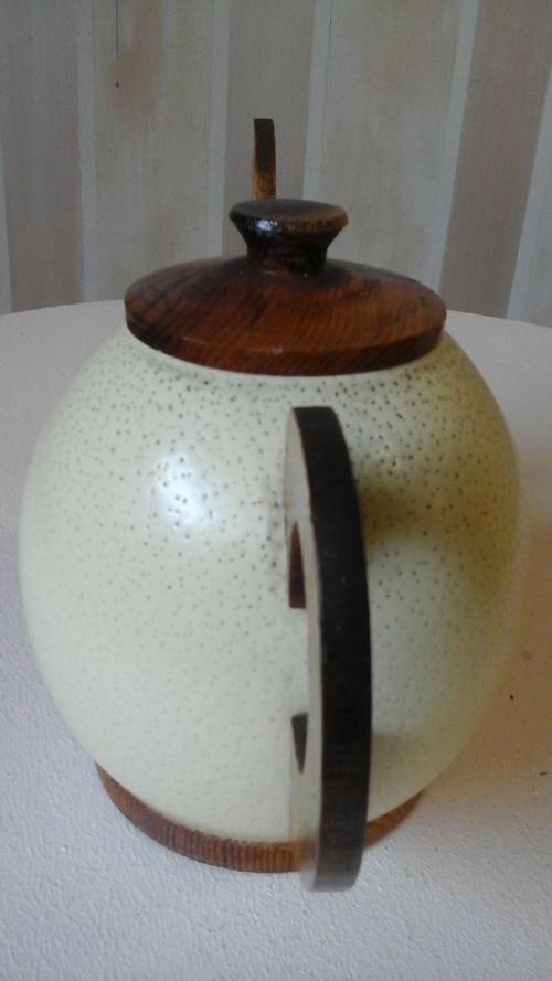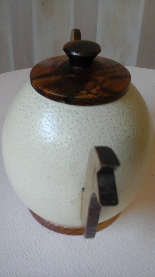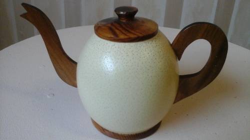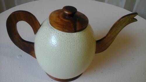 THIS FANTASTIC PIECE IS MADE FROM WOOD AND AN OSTRICH EGG. IT HAS A ROUNDED WOODEN BASE AND HAS A WOODEN HANDLE AND SPOUT GLUED TO IT.