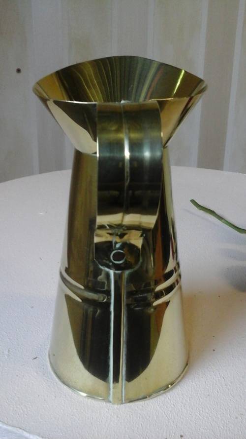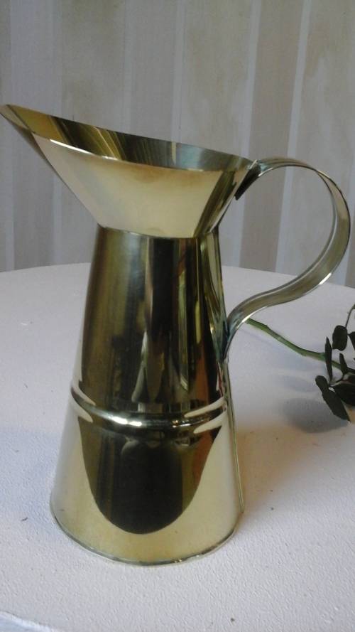 THIS FABULOUS JUG IS MADE FROM BRASS AND IS ROUND IN SHAPE. IT STARTS OR WIDE AND NARROWS AS IT GOES UP AS IT REACHES THE SPOUT IT WIDENS AGAIN.