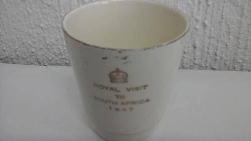 INCREDIBLE VINTAGE ROYAL VISIT TO SOUTH AFRICA COMMEMORATIVE CUP. DATED 1947. MADE IN ENGLAND. MADE FROM CHINA IT IS CREAMY WHITE IN COLOR WITH GOLD EDGING AND HAS THE PORTRAITS OF KING GEORGE VI AND QUEEN ELIZABETH ON ONE SIDE AND THE WRITING "ROYAL VISIT TO SOUTH AFRICA 1947" WITH THE CROWN ON THE OTHER SIDE. ON THE BOTTOM IT HAS A HALLMARK MADE IN ENGLAND. IT IS WELL WORN. IT HAS AGED AND GLAZED CRACKS AND THE GOLD EDGING IS FADED. IT MEASURES APPROXIMATELY 75 MM IN DIAMETER AND 83 MM HIGH. STILL AN AWESOME COLLECTORS PIECE!