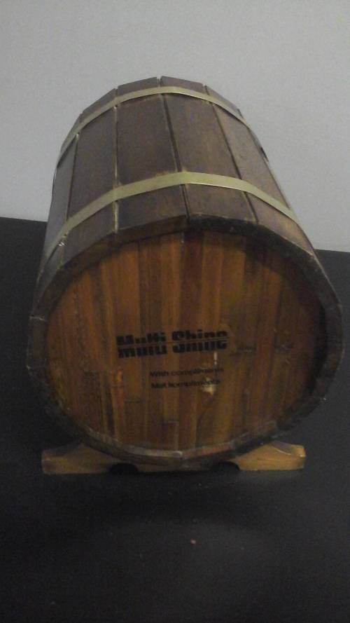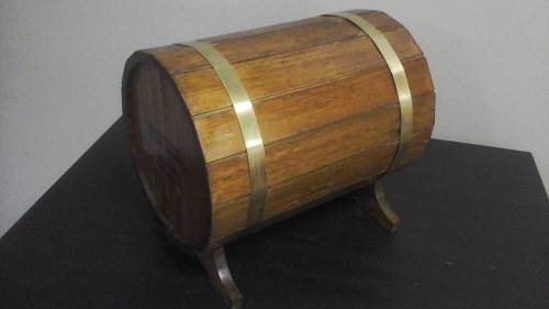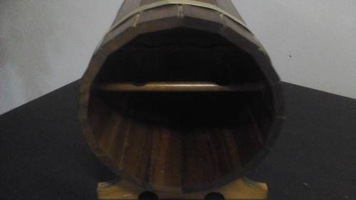 THIS STUNNING PIECE IS SHAPED TO LOOK LIKE A BARREL ON A STAND. IT HAS TWO SHELVES.