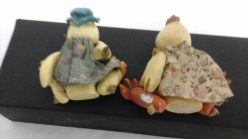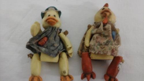 THE DUCK HAS A BLUE HAT AND IS DRESSED IN A CUTE LITTLE BLUE DRESS. THE ROOSTER IS DRESSED IN A CUTE BROWN FLORAL DRESS.BOTH THEIR ARMS AND LEGS MOVE.