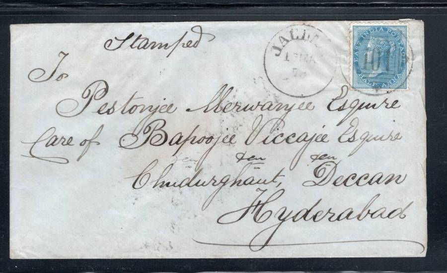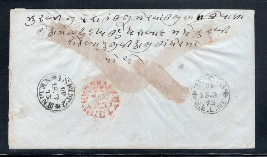 Cover sent to Hyderabad in 1873. See scans of front and back.