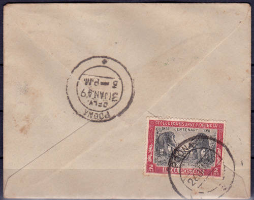 INDIA, 1949. Interesting cover with two different date stamps - 31 Jan 49 and 26 Jan 51 on the back. The cover is not in the greatest condition. Addresses blocked out. View scans for condition as it form part of the description. Note, display card not included, and, the line across the images are due to the display card that we use to scan items.