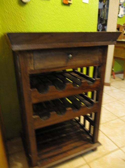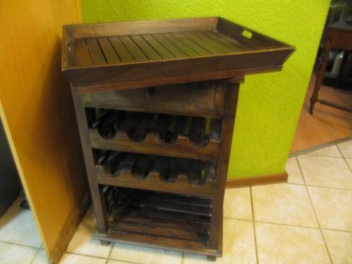 This wine rack / cabinet was originally purchased from a Indonesian-influence shop. With lovely dark wood and a nice design, it has a drawer as well as detachable top that becomes a tray to carry all those cocktails that you will be serving! The bottom section is a wine rack that can hold up to 8 bottles, and has a space at the bottom to store your bottles upright also.
